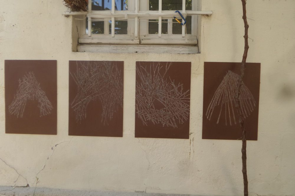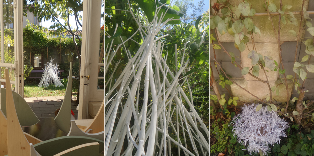 Simulations de constructions animales éphémères, foyers nomades : nid, cage ouverte, cabane, chaos de tiges et de branches, architecture primitive, refuge prêt à disparaître, à s'effacer dans l'espace évolutif du jardin.