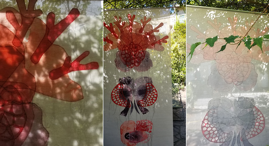 Textile (papiers teintés cousus sur voilage)